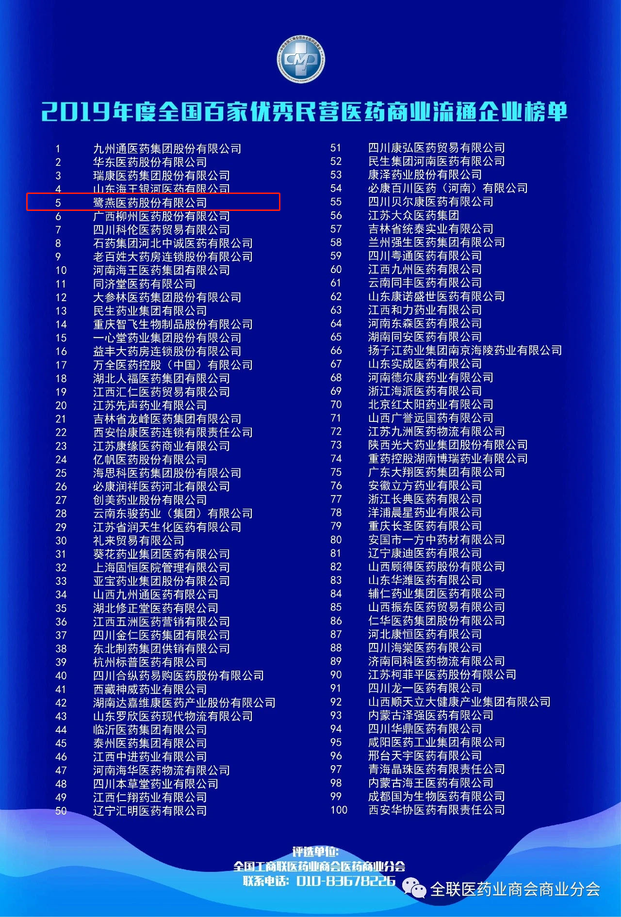 2020年9月11日,“第二屆全國民營醫(yī)藥商業(yè)企業(yè)家高峰論壇暨2019年度全國百家優(yōu)秀民營醫(yī)藥商業(yè)流通企業(yè)榜單發(fā)布會”在成都召開?;顒?dòng)現(xiàn)場揭曉了全國百家優(yōu)秀民營醫(yī)藥商業(yè)流通企業(yè)榜單,鷺燕醫(yī)藥股份有限公司(以下簡稱“鷺燕醫(yī)藥”)憑借穩(wěn)扎穩(wěn)打的優(yōu)秀實(shí)力,榮登榜單第五位。