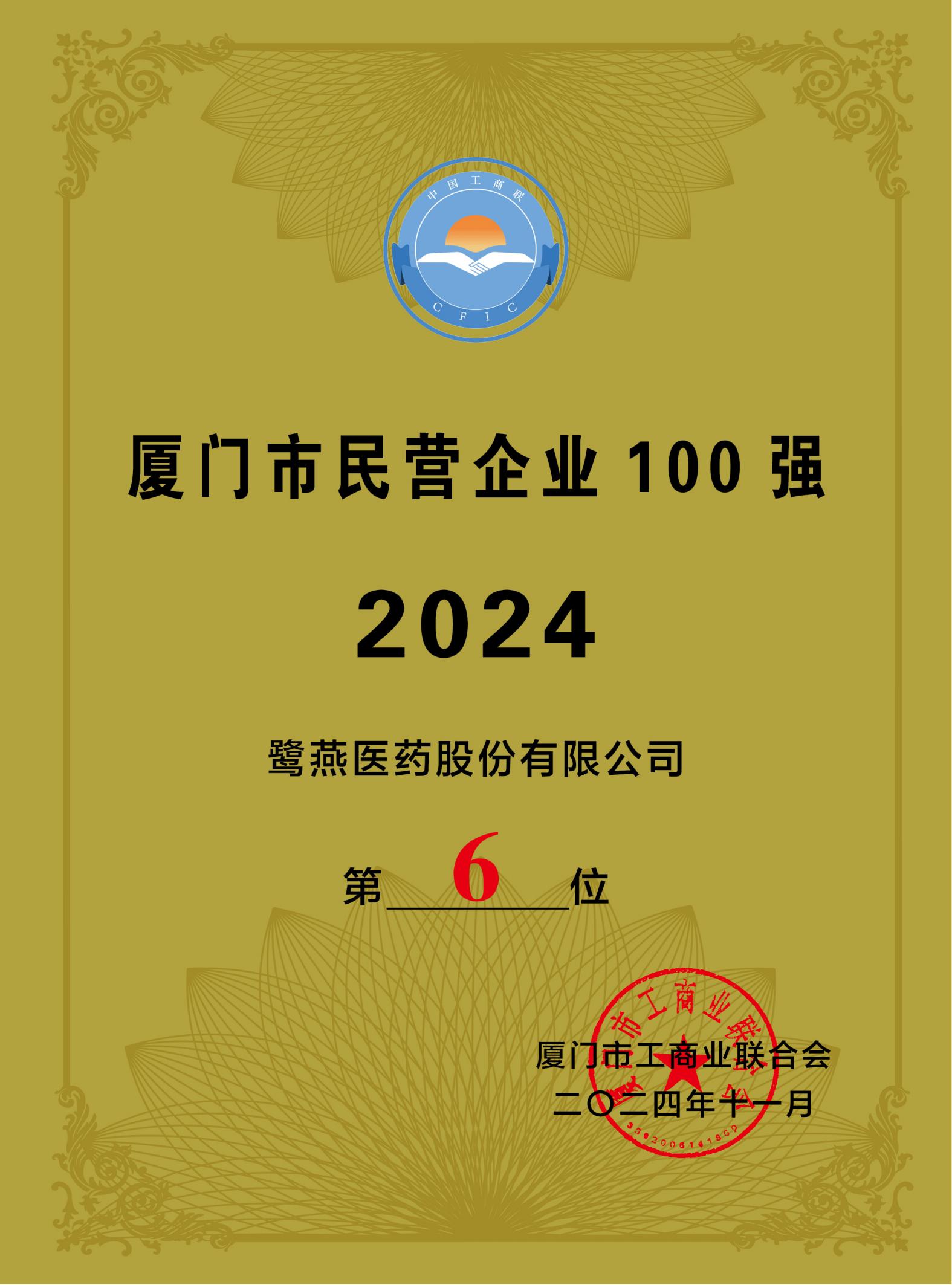 2024年廈門企業(yè)家日大會于11月1日召開,會上發(fā)布2024廈門市民營企業(yè)100強榜單、2024廈門市民營企業(yè)服務業(yè)20強榜單。鷺燕醫(yī)藥榮登2024廈門市民營企業(yè)100強榜單第6位,2024廈門市民營企業(yè)服務業(yè)20強榜單第4位!