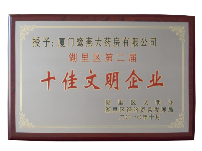 廈門鷺燕大藥房有限公司于2010年10月被廈門市湖里區(qū)文明辦、廈門市湖里區(qū)經(jīng)濟(jì)貿(mào)易發(fā)展局評為湖里區(qū)第二屆“十佳文明企業(yè)“榮譽(yù)稱號。