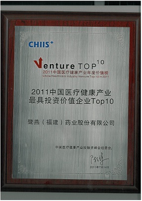 2011年7月14日,在北京舉辦的2011第五屆中國醫(yī)療健康產(chǎn)業(yè)投融資峰會上,鷺燕(福建)藥業(yè)股份有限公司榮獲“2011中國醫(yī)療健康產(chǎn)業(yè)最具投資價值企業(yè)TOP10”稱號。公司于2010年引進建銀國際醫(yī)療產(chǎn)業(yè)基金等投資者近1.5億元投資后,在公司治理、經(jīng)營業(yè)績、戰(zhàn)略布局等方面得到進一步提升,鞏固了公司在福建省醫(yī)藥流通領域的龍頭地位。