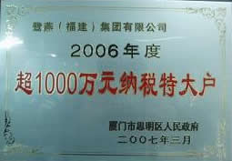 2007年3月9日,廈門(mén)市思明區(qū)在國(guó)際會(huì)展中心召開(kāi)2006年度納稅大戶(hù)表彰大會(huì),鷺燕(福建)集團(tuán)喜獲“2006年度超1000萬(wàn)元納稅特大戶(hù)”榮譽(yù)稱(chēng)號(hào)。